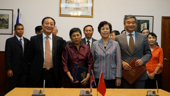 签约仪式上中柬签约人员合影:右起:中国文化遗产研究院院长刘曙光先生、中国驻柬大使布建国女士、柬埔寨王国文化艺术部大臣彭萨格娜女士、北京华协文化发展有限公司董事长汤毅嵩先生 |